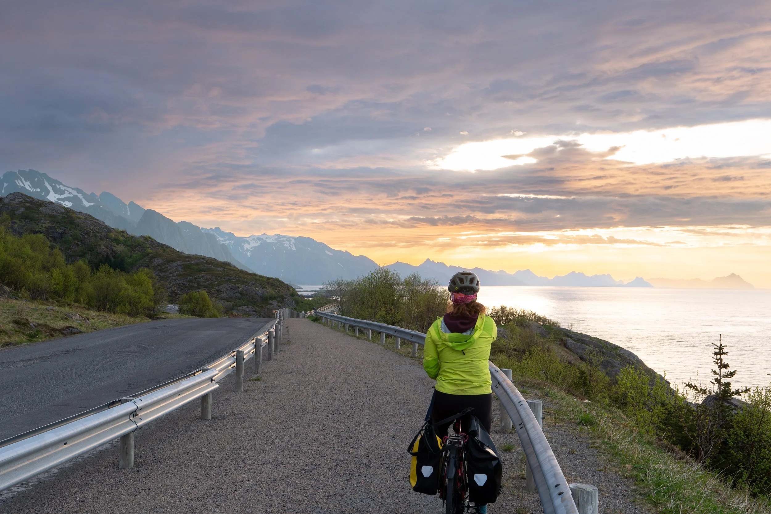 It's still early morning as we pass through a small saddle and get our first glimpse of Hamnoya. The morning is breathtaking, the colors offered by a seemingly never-ending golden hour are hitting their peak and illuminating the small fishing village below us. "This is what I came for." I say to Amanda as we catch our breath at the top of the climb. "It's amazing," she replies back. We are half a day behind, owing to SAS's temporary loss of our bags back in Dusseldorf, and a bit tired due to the midnight ferry ride, but none of those things are front of mind as we gaze down on an open road through the arctic paradise we came to explore. It's only been a few hours but I can already tell this is going to be a ride to remember.